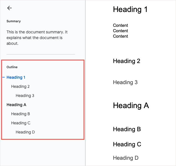 Για να χρησιμοποιήσετε το περίγραμμα, προσθέστε επικεφαλίδες στο έγγραφό σας (εξηγείται παρακάτω) και θα εμφανιστούν αυτόματα στο περίγραμμα. Στη συνέχεια, μπορείτε να επιλέξετε μια επικεφαλίδα για να μεταβείτε σε αυτό το τμήμα του εγγράφου.