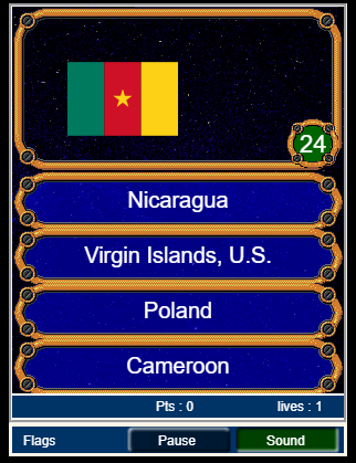 Οι σημαίες παιχνιδιού του Rubycave είναι όλα σχετικά με την ταυτοποίηση σημαίας. Έχετε 30 δευτερόλεπτα για να μαντέψετε ποια χώρα αντιπροσωπεύει η σημαία. Εάν επιλέξετε να δημιουργήσετε έναν λογαριασμό, μπορείτε να ανεβάσετε το σκορ σας και να κερδίσετε μετάλλια.