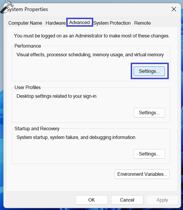 6. Θα εμφανιστεί ένα παράθυρο διαλόγου Ιδιότητες συστήματος. Στην ενότητα Απόδοση, κάντε κλικ στην επιλογή "Ρυθμίσεις«.