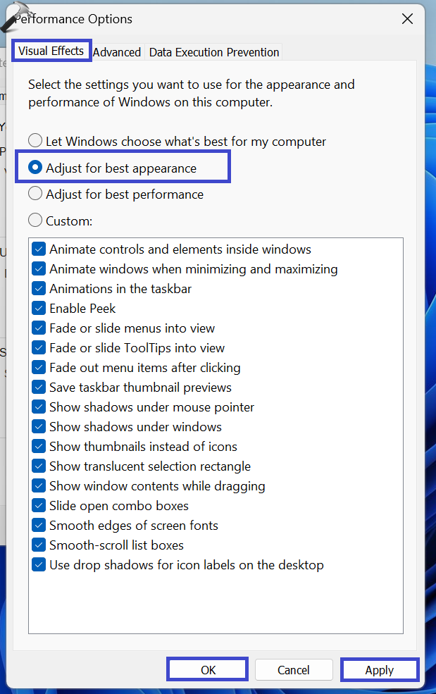 7. Θα εμφανιστεί ένα παράθυρο διαλόγου Επιλογές απόδοσης. Επιλέξτε το ""Ρυθμίστε για την καλύτερη απόδοση"Επιλογή.