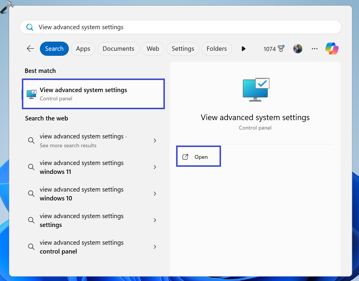 5. Στη συνέχεια, αναζήτηση "Προβολή προηγμένων ρυθμίσεων συστήματος"Στο μενού αναζήτησης. Κάντε κλικ στην επιλογή" Άνοιγμα ".