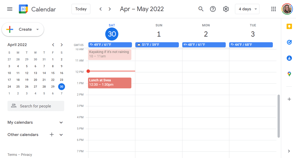 - Μεταβείτε στο πλαϊνό πίνακα:ΤύποςΑλλοτριώ+Ctrl+περίοδοςήΑλλοτριώ+Ctrl+κόμμα. Αυτό θα αλλάξει το επίκεντρο του δρομέα σας στον πλαϊνό πίνακα όπου μπορείτε να καρτέλετε μέσω επιλογών όπως το Google Keep, οι εργασίες, οι επαφές και οι χάρτες Google. ΤύποςΕισάγωΓια να ανοίξετε την επιλεγμένη εφαρμογή στον πλαϊνό πίνακα. Οι χρήστες MAC μπορούν να χρησιμοποιήσουνΕντολή+Επιλογή+περίοδοςήΕντολή+Επιλογή+κόμμα. Και αν έχετε ένα Chromebook, δοκιμάστεΑλλοτριώ+Αλλαγή+περίοδοςήΑλλοτριώ+Αλλαγή+κόμμα. Ο πλευρικός πίνακας είναι σχεδόν πανομοιότυπος με τον πλαϊνό πίνακα που μπορεί να χρησιμοποιήσετε ήδη στο Google Drive.