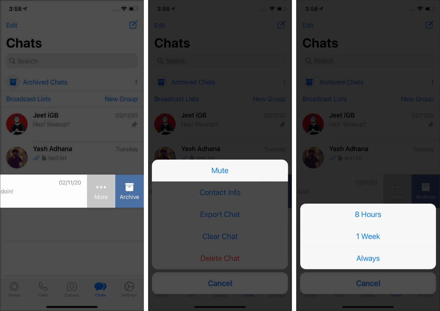 Ψάχνετε να μην ενοχλείτε από ασήμαντες ειδοποιήσεις; Είναι αβίαστο να σβήσετε ατομικές ή ομαδικές συνομιλίες στο WhatsApp. Γι 'αυτό, σύρετε αριστερά προς τα δεξιά σε μια συνομιλία, πατήστεΠερισσότερο→Βουβόςκαι επιλέξτε το επιθυμητόδιάρκεια.