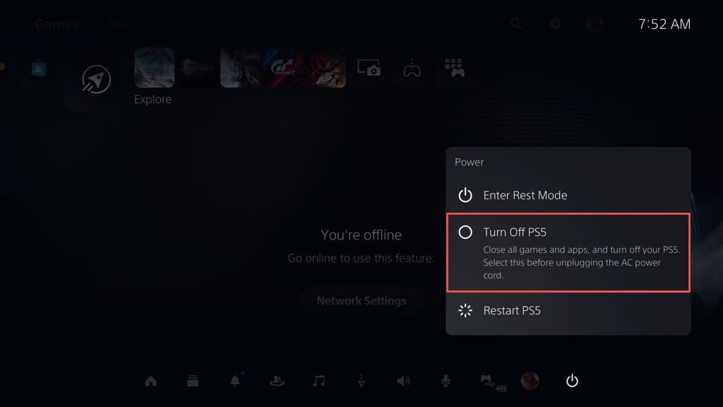 - Πατήστε το DualSense ή το DualSense Edge Controller'sΚουμπί PS, στη συνέχεια επιλέξτεΕξουσία>Απενεργοποιήστε το PS5.
