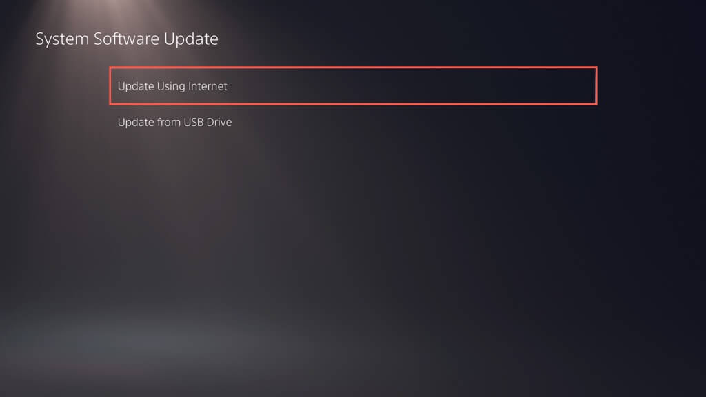 - ΕπιλέγωΕνημέρωση χρησιμοποιώντας το Διαδίκτυο. Αυτό θα πρέπει να ζητήσει από το PS5 να συνδεθεί με τους διακομιστές της Sony και να ελέγξει για νέες ενημερώσεις.