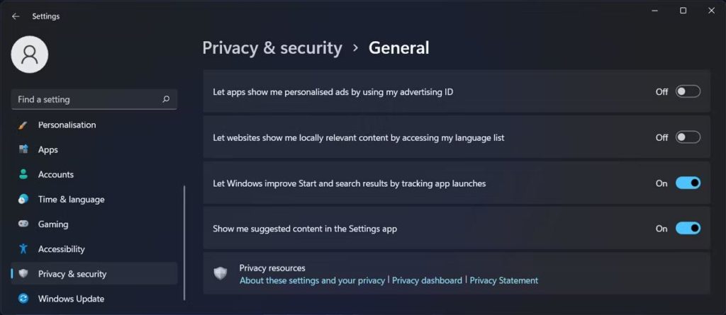Τα Windows 11 δίνουν έντονη έμφαση στην ιδιωτική ζωή και σας δίνουν εύκολη πρόσβαση σε ρυθμίσεις που σας επιτρέπουν να διαχειριστείτε τα δεδομένα σας. Μπορείτε να απενεργοποιήσετε τη λειτουργία ID διαφήμισης όπως φαίνεται εδώ: