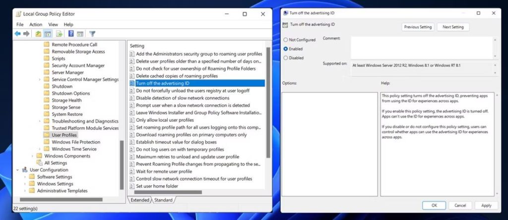 Ένα εργαλείο που βοηθά στη διαχείριση τόσο του συστήματος όσο και των ρυθμίσεων χρήστη είναι η πολιτική ομάδας των Windows. Μάθετε τα βήματα που μοιράζονται παρακάτω για να μάθετε πώς να το χρησιμοποιήσετε για να απενεργοποιήσετε το αναγνωριστικό διαφήμισης: