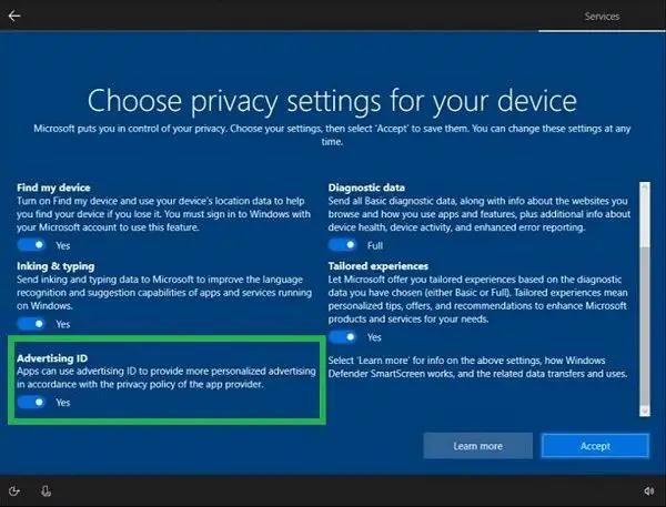 Εάν κάνετε μια νέα εγκατάσταση των Windows, τότε τα καλά νέα είναι ότι μπορείτε να διατηρήσετε το απόρρητό σας από την πρώτη περίπτωση, απενεργοποιώντας το διακόπτη εναλλαγής για διαφήμιση όταν επιλέγετε τις ρυθμίσεις απορρήτου σας. Απλώς απενεργοποιήστε την εναλλαγή αναγνωριστικού διαφήμισης κατά την ολοκλήρωση της διαδικασίας εγκατάστασης.