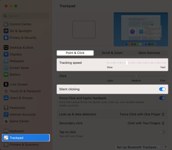 ΠηγαίνωΡυθμίσεις συστήματος→ ΕπιλέξτεTrackpad, ποντίκι ή πληκτρολόγιοΓια να προσαρμόσετε τα πράγματα, όπως η σιωπηλή κλικ και η ταχύτητα παρακολούθησης.