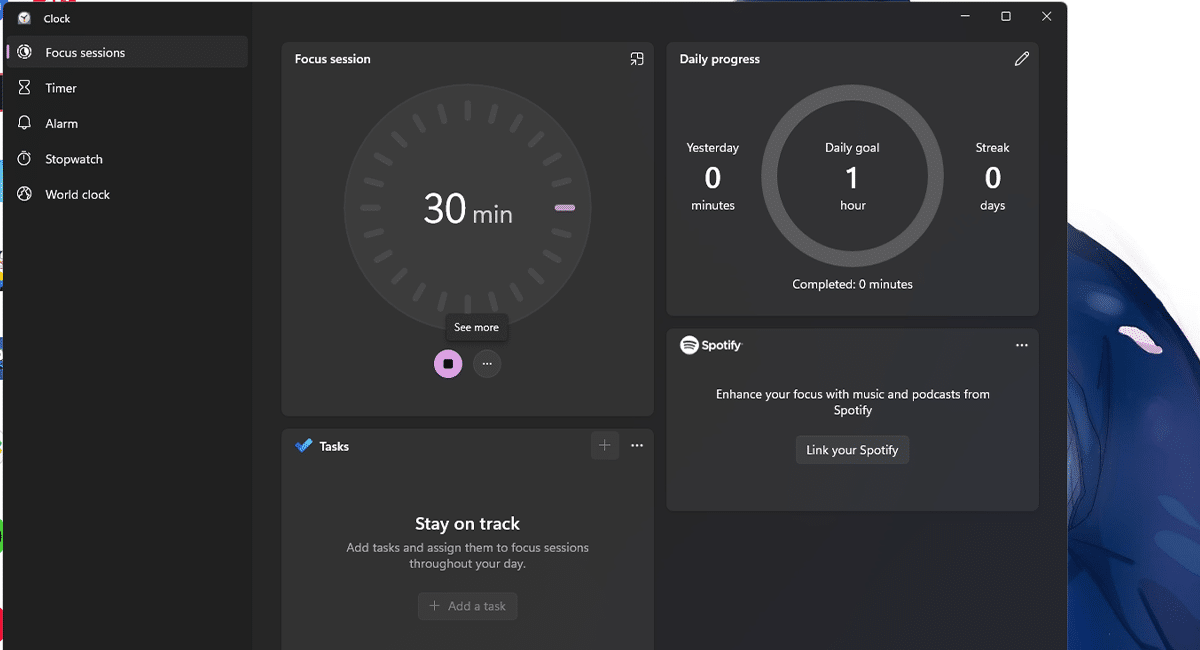 - Μέσα στην εφαρμογή ρολογιού, ξεκινώντας από 15 λεπτά έως 240 λεπτά, μπορείτε να ορίσετε τη συνεδρία εστίασης. Μπορείτε επίσης να ρυθμίσετε το Spotify για να ακούσετε μουσική ενώ χαλαρώνετε ή εργάζεστε.
