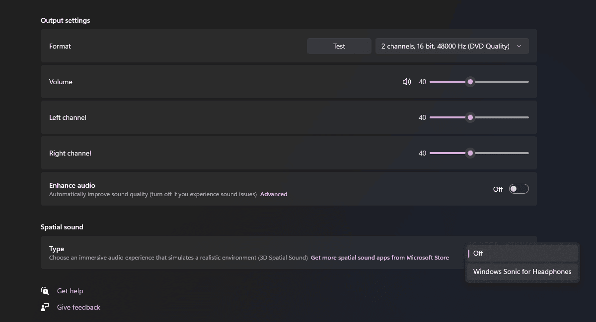 - Παρακάτω θα δείτε μια επιλογή για το "Spatial Sound"> απλά αλλάξτε την επιλογή από το Off σε "Windows Sonic for Headphones".