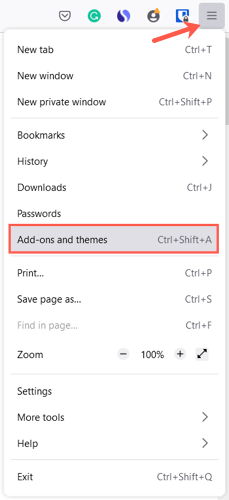 Για να αποκτήσετε πρόσβαση στην ενότητα θεμάτων των ρυθμίσεων του προγράμματος περιήγησης Firefox εύκολα, επιλέξτε τοτρεις γραμμέςΣτο πάνω δεξιά του παραθύρου για να δείτε τοΜενού εφαρμογής. ΕπιλέγωΠρόσθετα και θέματα.