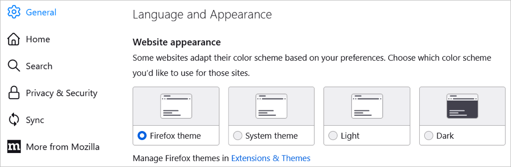 ΠαρακάτωΓλώσσα και εμφάνιση, μπορείτε να επιλέξετε ένα χρωματικό σχήμα για ιστότοπους όπως το θέμα του συστήματός σας, η λειτουργία φωτός ή η σκοτεινή λειτουργία.