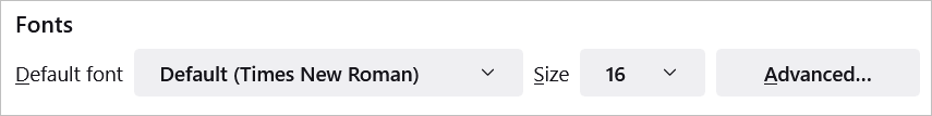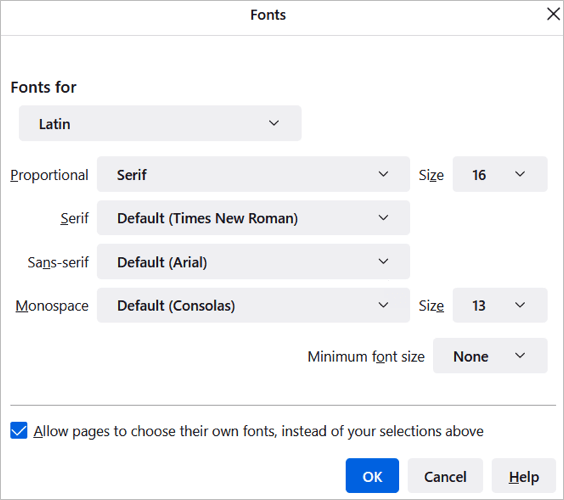 Στη συνέχεια, επιλέξτεΠροχωρημένοςΓια να επιλέξετε συγκεκριμένα στυλ γραμματοσειράς και μεγέθη για αναλογικές γραμματοσειρές, Serif, Sans-Serif και Monospace. Μπορείτε επίσης να επιλέξετε ένα ελάχιστο μέγεθος γραμματοσειράς.
