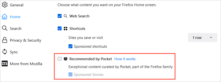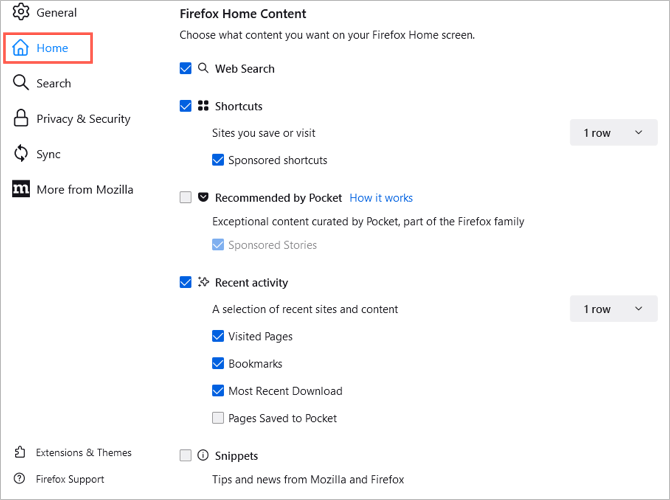 Για να αλλάξετε αυτήν τη σελίδα, επιστρέψτε στοΜενού εφαρμογής>Ρυθμίσειςκαι επιλέξτεΣπίτιστα αριστερά. Στη συνέχεια, χρησιμοποιήστε τις επιλογές προσαρμογής στοΠεριεχόμενο στο σπίτι του Firefoxτμήμα.