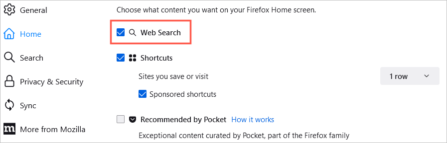 Για να εμφανίσετε ένα πλαίσιο αναζήτησης ιστού στην αρχική σελίδα, ελέγξτε το πλαίσιο γιαΑναζήτηση ιστού.