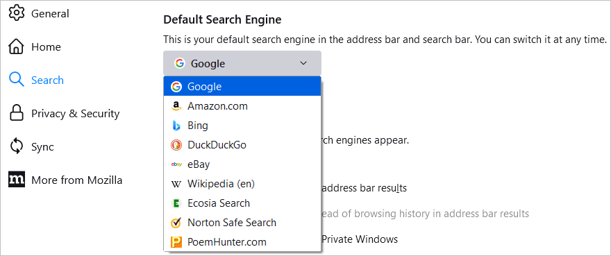 Μπορείτε να επιλέξετε την προεπιλεγμένη μηχανή αναζήτησης για αυτό το πλαίσιο και τη γραμμή αναζήτησης του Firefox. Στα αριστερά, επιλέξτεΕρευνα. Στη συνέχεια, χρησιμοποιήστε το αναπτυσσόμενο πλαίσιο παρακάτωΠροεπιλεγμένη μηχανή αναζήτησηςγια να κάνετε την επιλογή σας.
