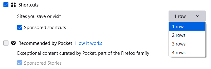 Για να δείτε ιστότοπους που αποθηκεύετε, ελέγξτε το πλαίσιο γιαΣυντομεύσεις. Στη συνέχεια, στα δεξιά, χρησιμοποιήστε το αναπτυσσόμενο πλαίσιο για να επιλέξετε τον αριθμό των σειρών που θέλετε να δείτε. Προαιρετικά, μπορείτε να επισημάνετε την επιλογή για προβολήΣυντομεύσεις με χορηγίες.