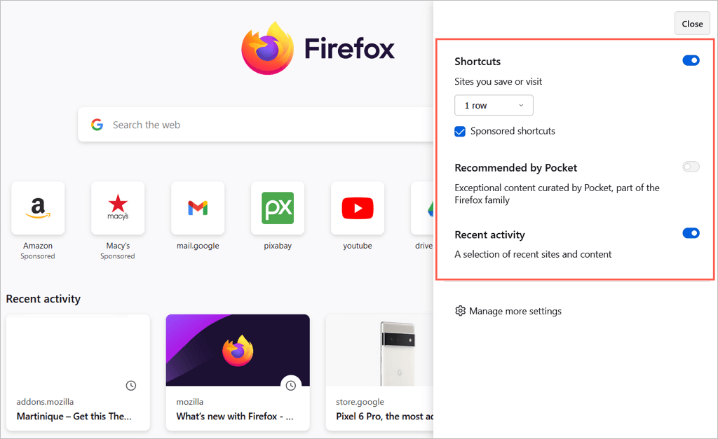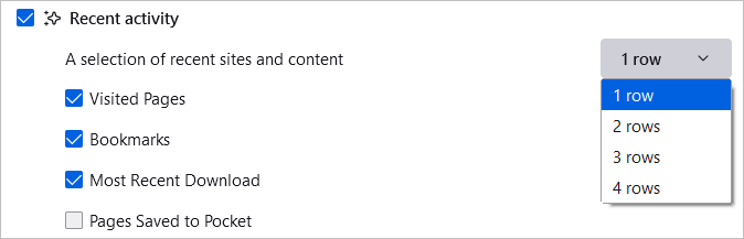 Για γρήγορη πρόσβαση σε ιστότοπους που μόλις επισκεφθήκατε, ελέγξτε το πλαίσιο γιαΠρόσφατη δραστηριότητα. Στη συνέχεια, χρησιμοποιήστε το αναπτυσσόμενο πλαίσιο προς τα δεξιά για να επιλέξετε τον αριθμό των σειρών που θέλετε να δείτε. Μπορείτε να προσαρμόσετε την πρόσφατη δραστηριότητα χρησιμοποιώντας αυτά τα πλαίσια ελέγχου για σελίδες επισκέψεων, σελιδοδείκτες και τις άλλες επιλογές.