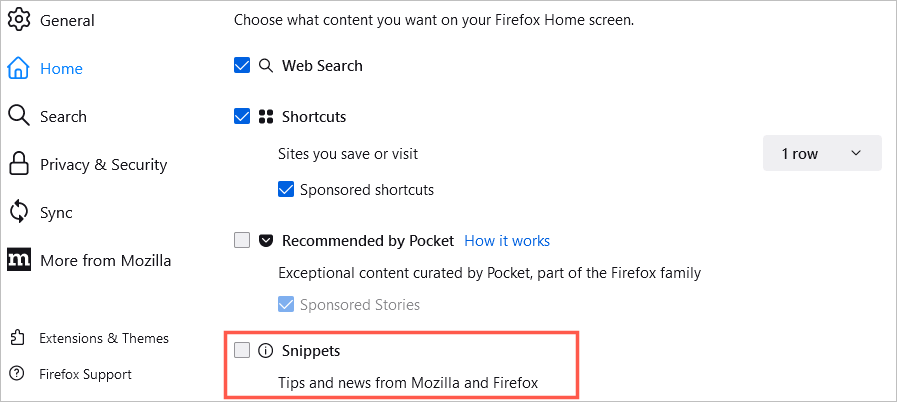 Τέλος, μπορείτε να επιλέξετε να δείτε συμβουλές και ειδήσεις τόσο από το Mozilla όσο και από τον Firefox στην αρχική σας σελίδα. Ελέγξτε το πλαίσιο γιαΑποσπάσματαΓια να εμφανίσετε αυτά τα στοιχεία.