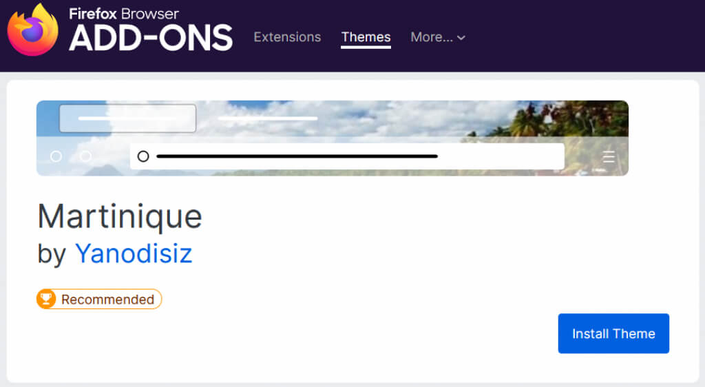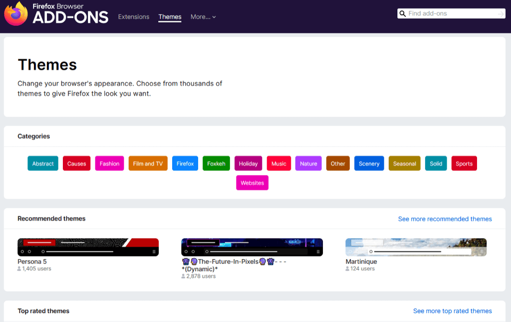 Για να περιηγηθείτε σε θέματα, επιλέξτεΒρείτε περισσότερα θέματαΣτο κάτω μέρος της σελίδας. Στη συνέχεια, θα δείτε κατηγορίες, συστάσεις, τάσεις και κορυφαία θέματα στο κατάστημα πρόσθετων Firefox. Επιλέξτε μια κατηγορία ή επιλέξτε τοΔείτε περισσότερασύνδεσμος προς το δικαίωμα μιας ενότητας για να δείτε τη συλλογή.