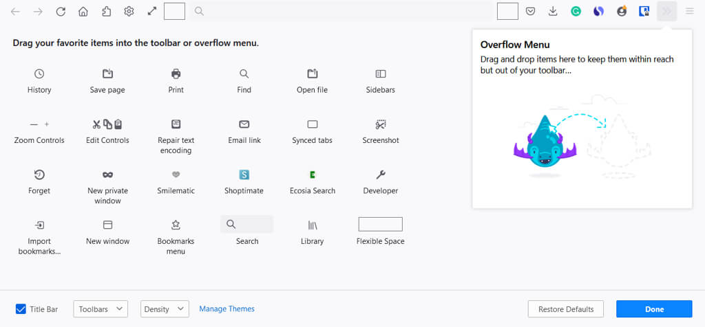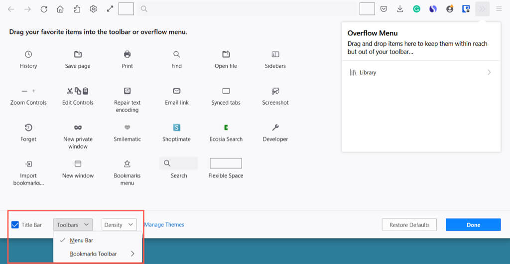 Μπορείτε επίσης να προσθέσετε στοιχεία στο μενού υπερχείλισης. Αυτό τους κρατάει βολικό, αλλά όχι στην κύρια ενότητα εργαλείων. Σύρετε ένα αντικείμενο στοΜενού υπερχείλισηςπαράθυρο.