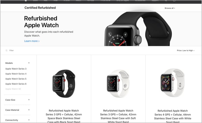 Το Certified Refurbished Apple Watch θα αποσταλεί σε ένα νέο λευκό κουτί. Θα λάβετε επίσης μια επιλογή παράδοσης μιας ημέρας. Οι εκπτώσεις ξεκινούν στο 10% και πηγαίνουν μέχρι το 35% για το παλαιότερο ρολόι της Apple.