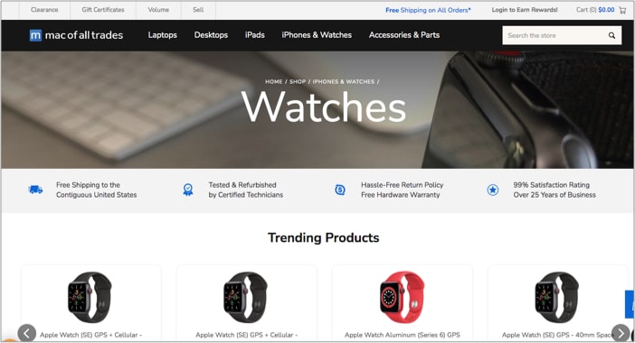 Το MAC όλων των συναλλαγών είναι ένας συγκεντρωτής για ανακαινισμένα προϊόντα της Apple. Με άλλα λόγια, απαριθμούν ανακαινισμένα το Apple Watch από πολλούς πωλητές. Μπορείτε να επιλέξετε ανάμεσα στο "εργοστάσιο σφραγισμένο, εξαιρετικό, πολύ καλό και καλό". Μου άρεσε ο τρόπος με τον οποίο μπορείτε να φιλτράρετε τα προϊόντα σύμφωνα με τις συνθήκες.