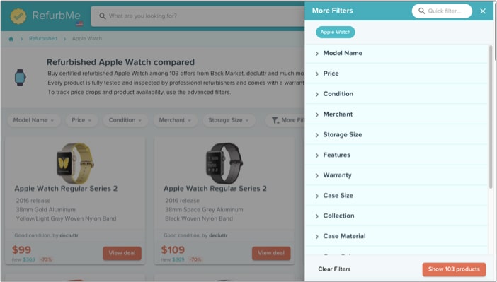 Το Refurbme είναι μια πλατφόρμα συσσωρευτή με πολλά χρήσιμα χαρακτηριστικά. Έχει δημιουργήσει φίλτρα και πρότυπα για διάφορες παραμέτρους, συμπεριλαμβανομένης της φθοράς, της πολιτικής εγγύησης, της υγείας της μπαταρίας κλπ. Μου άρεσε ο σχεδιασμός των καταναλωτών και η διαδικασία σύγκρισης.