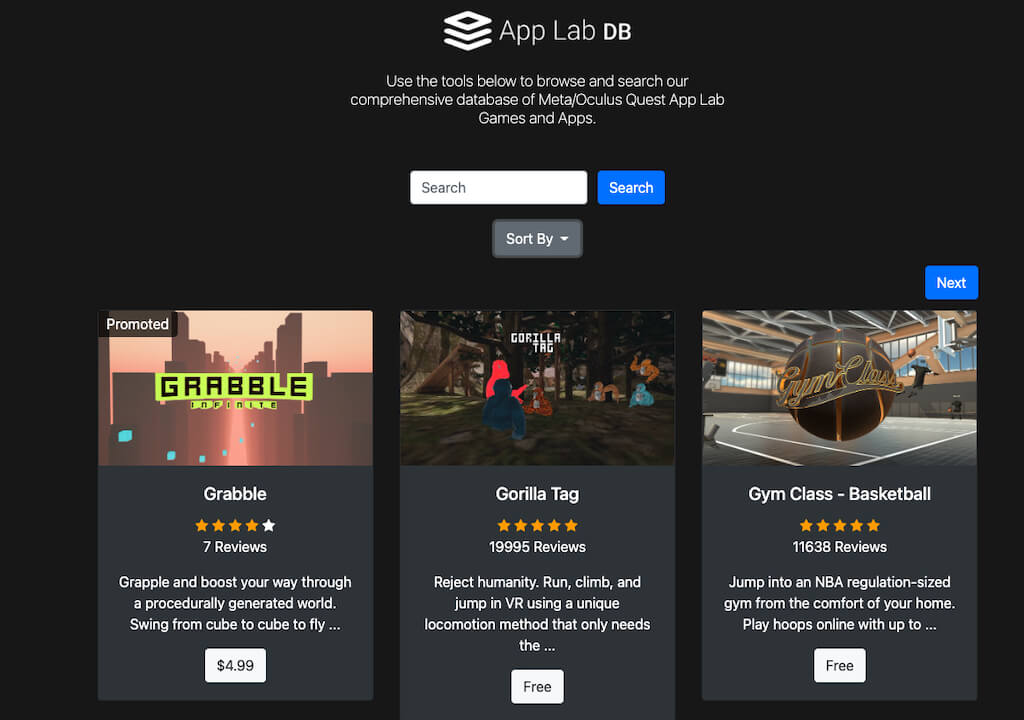 Το App Lab DB είναι μια βάση δεδομένων εργασίας όλων των γνωστών παιχνιδιών App Lab. Σας επιτρέπει να ταξινομήσετε με δημοτικότητα, ηλικία, βαθμολογία και ακόμη και τιμή. Μπορείτε επίσης να αναζητήσετε συγκεκριμένους τίτλους. Μερικά από τα πιο γνωστά παιχνίδια Quest 2 σήμερα (όπως η Gorilla Tag) ξεκίνησαν το App Lab.