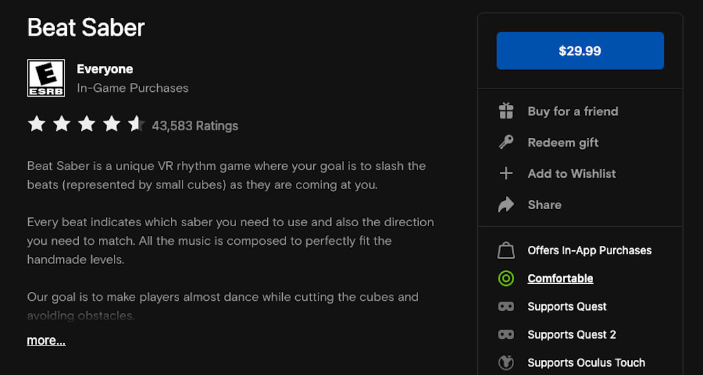 Μπορείτε να βρείτε το επίπεδο άνεσης ενός παιχνιδιού επιλέγονταςΠερισσότερες πληροφορίεςΣτη σελίδα εφαρμογής του Oculus Store.