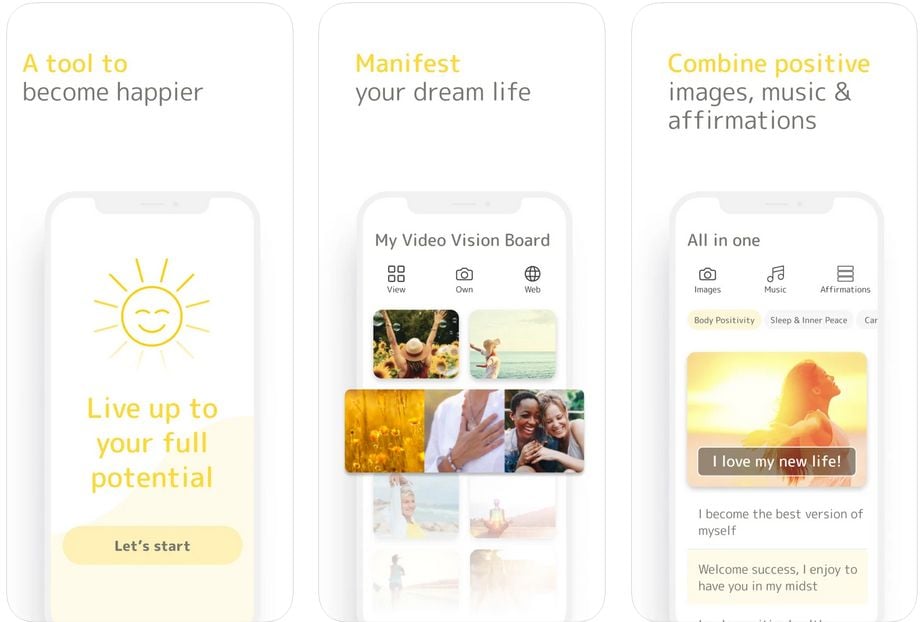 Αυτή η εφαρμογή είναι ένας πολύ καλός τρόπος για να δημιουργήσετε ένα σύστημα όρασης και ένα σύστημα καθορισμού στόχων στο οποίο μπορείτε να αναφέρετε συχνά. Μπορείτε να προσθέσετε οποιεσδήποτε φωτογραφίες που θέλετε, να προσθέσετε ένα φίλτρο εάν επιθυμείτε και να γράψετε την επιβεβαίωσή σας ως λεζάντα στη φωτογραφία. Μπορείτε να πατήσετε στο εικονίδιο των ματιών για να έχετε ένα παιχνίδι διαφανειών του πίνακα όρασης σας. Μπορείτε επίσης να πάτε στις ρυθμίσεις για να αλλάξετε τη μουσική που παίζεται, συμπεριλαμβανομένης της μουσικής από το τηλέφωνό σας.