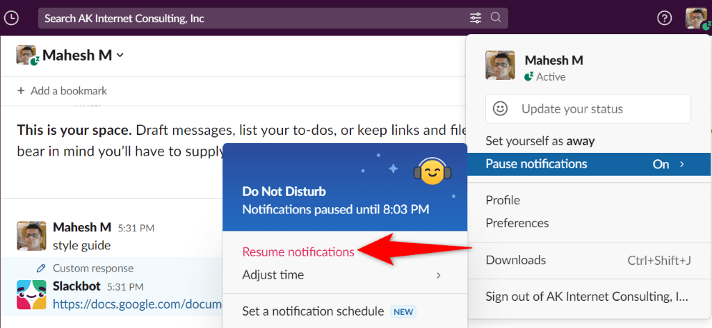 Ένας λόγος που δεν λαμβάνετε ειδοποιήσεις Slack είναι ότι έχετε σταματήσει τις ειδοποιήσεις στην εφαρμογή. Η εφαρμογή του Slack τόσο για την επιφάνεια εργασίας όσο και για το Mobile προσφέρει μια εναλλαγή, επιτρέποντάς σας να ενεργοποιήσετε και να απενεργοποιήσετε τις ειδοποιήσεις σας.