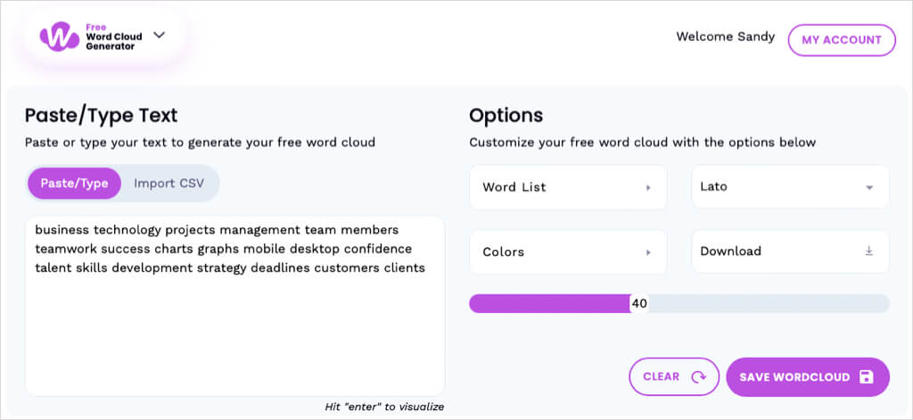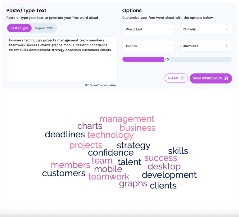 Για να ξεκινήσετε, να επικολλήσετε, να πληκτρολογήσετε ή να εισαγάγετε ένα αρχείο CSV με το κείμενό σας. Θα δείτε ένα προεπιλεγμένο σύννεφο λέξεων που μπορείτε να προσαρμόσετε με τις παρακάτω επιλογές.