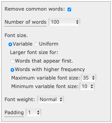 - Διαχειριστείτε τη λίστα λέξεων σας αφαιρώντας τις κοινές λέξεις, επιλέγοντας τα ελάχιστα και μέγιστα μεγέθη γραμματοσειρών και επιλέγοντας το βάρος και την επένδυση γραμματοσειράς.