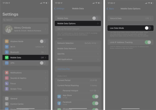 Για να το κάνετε αυτό, μεταβείτε στα iPhone σαςΡυθμίσεις→Κινητά δεδομένα→Επιλογές δεδομένων για κινητά. Στη συνέχεια, αλλάξτεΛειτουργία χαμηλής δεδομένων. Ωστόσο, μπορείτε να δείτε πώς να αυξήσετε την ταχύτητα των κυτταρικών δεδομένων για να βελτιώσετε την απόδοση του WhatsApp.