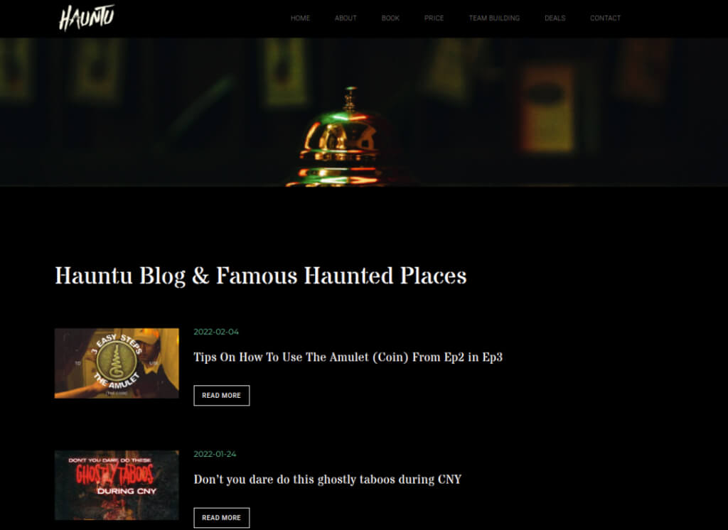 Το Hauntu είναι ένας ιστότοπος που διευθύνεται από τους ιδιοκτήτες του Colle Eastern Hotel στη Μαλαισία. Τρέχουν μια "πραγματική εμπειρία στο σπίτι", πλήρης με ηθοποιούς, ειδικά εφέ και πολλά άλλα. Επισκεφτώ τοενότητα ιστολογίουτου ιστότοπου για να διαβάσετε ένα ευρύ φάσμα ιστοριών για στοιχειωμένα μέρη σε όλο τον κόσμο (όχι μόνο στη Μαλαισία!)
