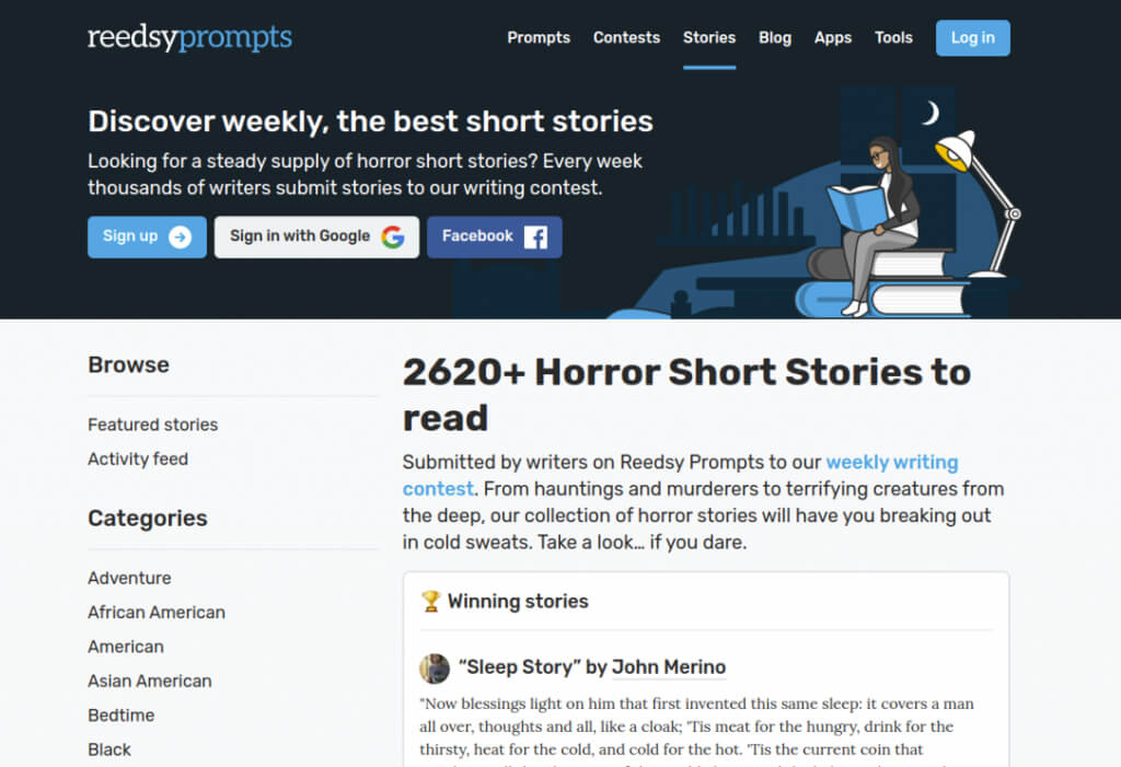 Εάν η μικρή συλλογή των τρομακτικών ιστοριών σε άλλες τοποθεσίες απλά δεν το κόβει για εσάς, τότε θα λατρέψετε την ατελείωτη προσφορά τους διαθέσιμη στο Reedsy προτροπές. Αυτός ο ιστότοπος διαχειρίζεται έναν εβδομαδιαίο διαγωνισμό γραφής, όπου οι συγγραφείς υποβάλλουν τις ιστορίες τους για να κερδίσουν το κορυφαίο βραβείο των $ 250 (ή περισσότερο) και να εμφανίζονται στον ιστότοπο.