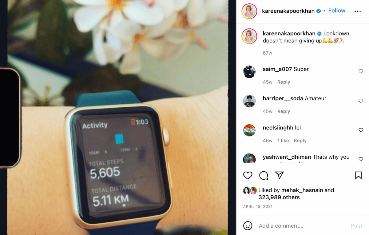 Η ηθοποιός Kareen Kapoor Khan's Post OnInstagramΑγοράστε το Ring Fire-Boltt Ring 3 Smartwatch λέγοντας ότι την βοηθά να παραμείνει σε φόρμα επιτρέποντάς της να εντοπίσει την ικανότητά της. Ωστόσο, στο Instagram, έχει επίσηςδημοσίευσε μια φωτογραφίαστην οποία φοράει ένα ρολόι Apple με μια ροζ πλεκτή ζώνη βρόχου.Στις 18 Απριλίου 2021, μοιράστηκε επίσης μια εικόνα των συνολικών βημάτων σε ένα Apple Smartwatch.