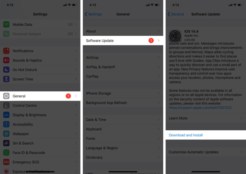 Για iPhone: Ανοίξτε τοΡυθμίσειςapp → ΠατήστεΓενικός→ ΠατήστεUpdat λογισμικούe →Λήψη και εγκατάστασηΕάν βλέπετε μια εκκρεμούσα ενημέρωση.