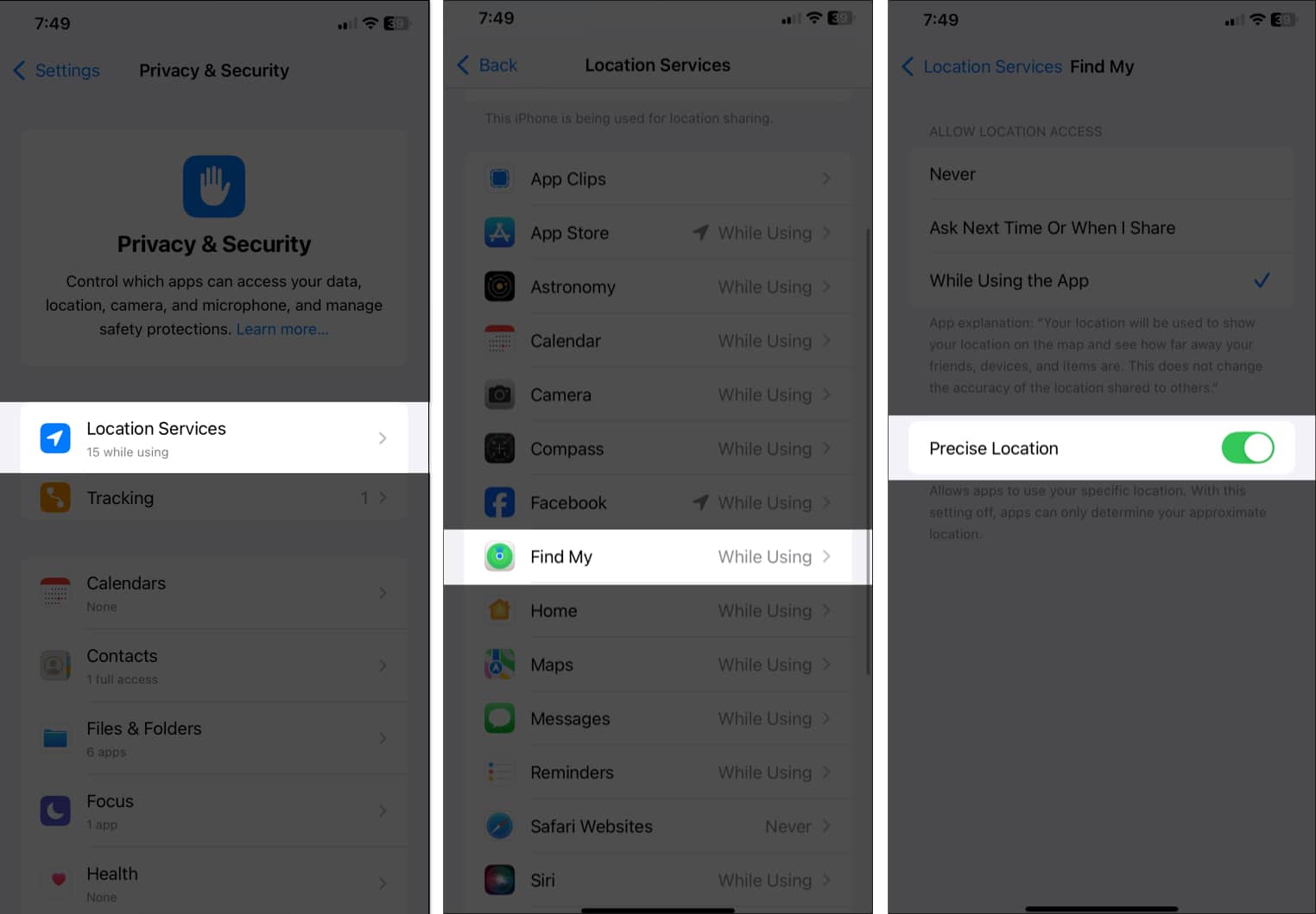 Επίσης, βεβαιωθείτε ότι η εύρεση ακριβείας Airtag είναι ενεργοποιημένη, ώστε να μπορείτε εύκολα να εντοπίσετε τα υπάρχοντά σας. Για να το κάνετε αυτό, κατευθυνθείτε προςΡυθμίσεις→Ιδιωτικότητα και ασφάλεια→Υπηρεσίες τοποθεσίας→Βρίσκω το δικό μουκαι εναλλαγή στοΑκριβής τοποθεσίαεπιλογή. Τώρα, ελέγξτε αν μπορείτε να παρακολουθείτε την Airtag για να βρείτε το δικό μου.