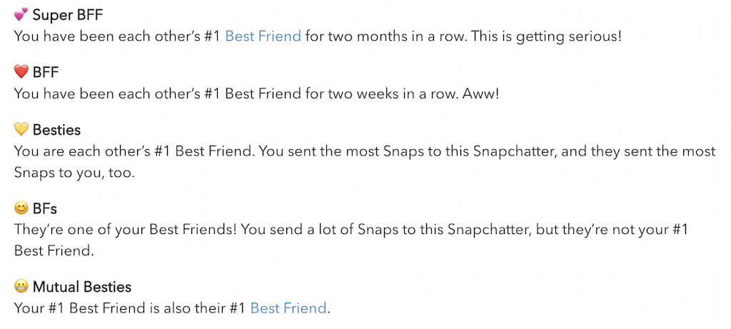 Άλλα emojis μπορείτε να δείτε στη λίστα των καλύτερων φίλων σας είναιχρυσή καρδιάκαι έναGrimace Emoji. Η χρυσή καρδιά σηματοδοτεί το άτομο που στέλνετε snaps στα περισσότερα, τα οποία επίσης στέλνουν snaps σε σας περισσότερο. Το grimace ή τα δόντια Emoji σημαίνει εσείς και το άτομο που σηματοδοτεί έχετε έναν αμοιβαίο #1 καλύτερο φίλο στο Snapchat.