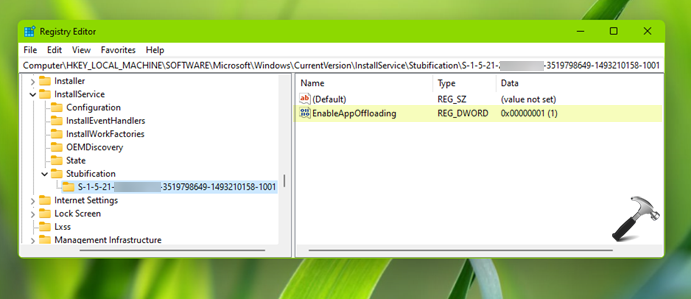 3.Κάτω από την αυταπάτη,Εντοπίστε το αναγνωριστικό ασφαλείας του λογαριασμού σας (SID)βασισμένο στο υπο-κλειδί μητρώου. Στο δεξιό παράθυρο αυτού του υπο-κλειδιού, δημιουργήστεEnableappoffoffloadingΜητρώο DWORD (reg_dword) και ρυθμίστε το στο1Για να ενεργοποιήσετε τις εφαρμογές αρχειοθέτησης για το λογαριασμό που κρατά το SID.