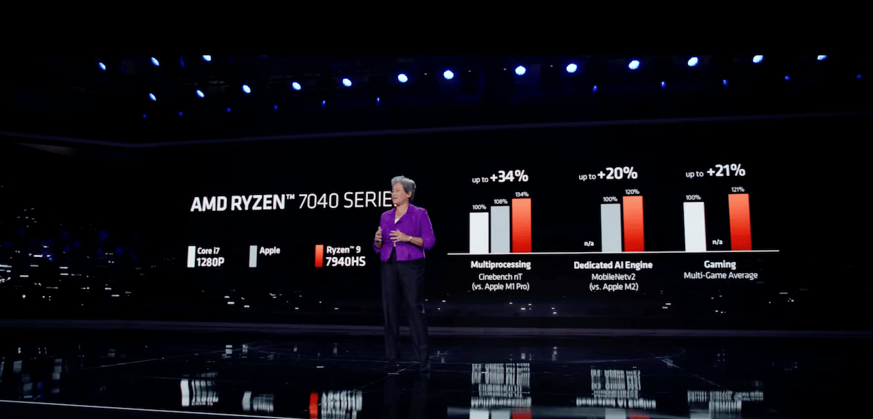 Η AMD ανακοίνωσε τους νέους επεξεργαστές σειράς AMD Ryzen 7040 για φορητούς υπολογιστές και φορητούς υπολογιστές στο Consumer Electronics Show (CES). Στην εκδήλωση, η CEO της AMD Lisa Su ισχυρίστηκε επίσης ότι τα νέα τσιπ δεν είναι μόνο ταχύτερα από τα μάρκες M1 Pro και M2 της Apple, αλλά και πιο αποτελεσματικές.