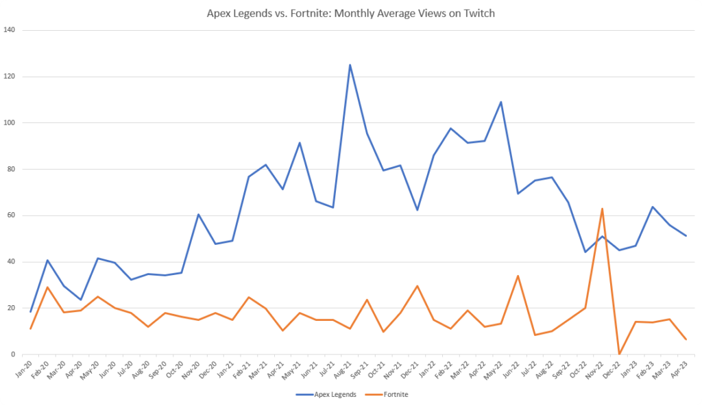 Το παραπάνω γράφημα δείχνει τον τρόπο με τον οποίο οι μέσες μηνιαίες μετρήσεις προβολής έχουν αλλάξει τα τελευταία τρία χρόνια. Μπορούμε να δούμε ότι από τον Ιανουάριο του 2020, το περιεχόμενο των Legends 'Apex έχει πάρει περισσότερες μέσες απόψεις από το Fortnite.