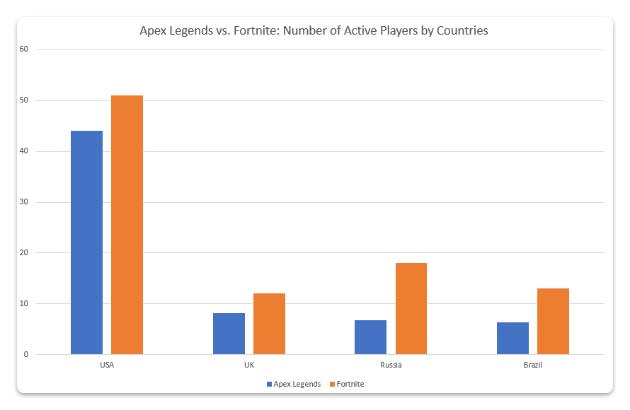 Αναμφισβήτητα, αυτά τα δύο παιχνίδια είναι πολύ δημοφιλή σε όλο τον κόσμο. Στις ΗΠΑ, η Apex Legends έχει το 38,92% του συνολικού αριθμού των παικτών του. Για το Fortnite, είναι 21,63%. Έχουμε επίσης συλλέξει το ποσοστό άλλων χωρών που μπορούν να αναφερθούν επίσης.