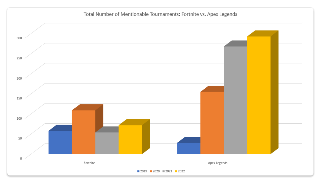 Σύμφωνα με τα διαγράμματα esports, τόσο η Apex όσο και η Fortnite είχαν πολλά επίσημα και ανεπίσημα τουρνουά. Οι παρακάτω πίνακες δείχνουν τον αριθμό των τουρνουά για αυτά τα δύο παιχνίδια από το 2019 έως το 2022.