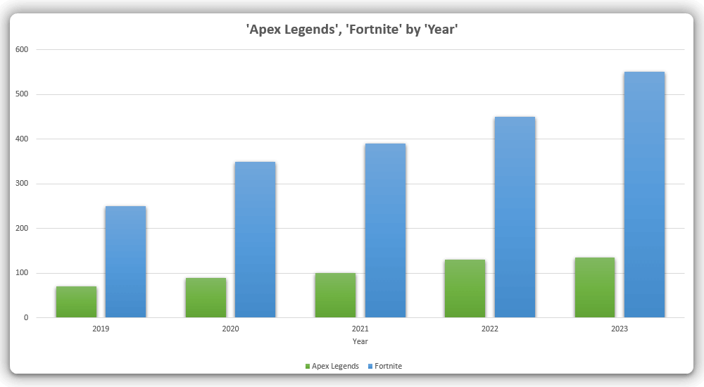 Κάθε χρόνο, οι παίκτες παρακολουθούν τουρνουά τόσο για τους Legends Apex όσο και για το Fortnite. Ορισμένα από αυτά τα γεγονότα είναι επίσημα. Ακολουθούν μερικά ενδιαφέροντα στατιστικά στοιχεία και γραφήματα σχετικά με αυτά τα γεγονότα: