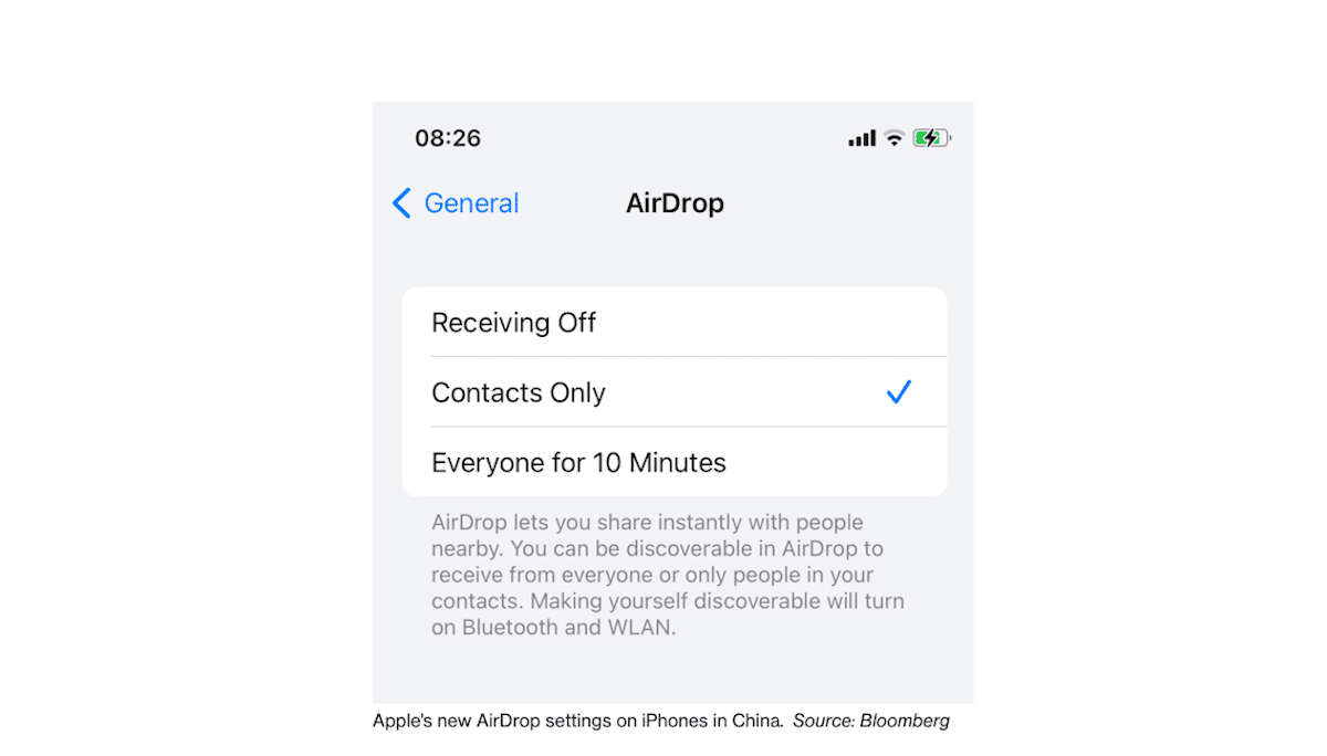 Στις αρχές Νοεμβρίου, οι χρήστες στην Κίνα άρχισαν να αναφέρουν ότι δεν μπόρεσαν να λάβουν περιεχόμενο από τυχαίους χρήστες μέσω AirDrop μετά από ορισμένο χρονικό διάστημα. Αυτό φέρεται να έγινε για να δυσκολεύει τους αντι-κυβερνητικούς διαδηλωτές στην Κίνα να διανείμει σχετικό περιεχόμενο.