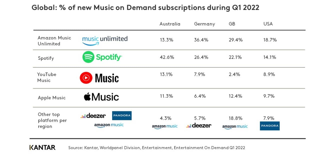 Σύμφωνα με την έρευνα που διεξήχθη από τη δημοσίευση, η Apple Music σημείωσε 12,4% νέους συνδρομητές στο Ηνωμένο Βασίλειο κατά τη διάρκεια του 1ου πρώτου '2022. 11,3% στην Αυστραλία, 6,4% στη Γερμανία και 9,7% στις Ηνωμένες Πολιτείες. Κατά την ίδια περίοδο, η Spotify σημείωσε 22,1% νέους συνδρομητές στο Ηνωμένο Βασίλειο, 42,6% στην Αυστραλία, 26,4% στη Γερμανία και 14,1% στις Ηνωμένες Πολιτείες